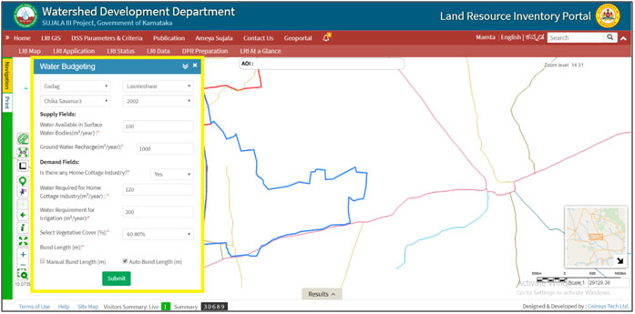 - Based on parameters like human population, livestock population, per capita water consumption for domestic use, livestock use, surface runoff from infiltration method, existing water resource availability per year the system calculates the result. The result table displays farmers name (On clicking the hyperlink the user is able to get information regarding land code, owner details and area of the land parcel from Bhoomi data)